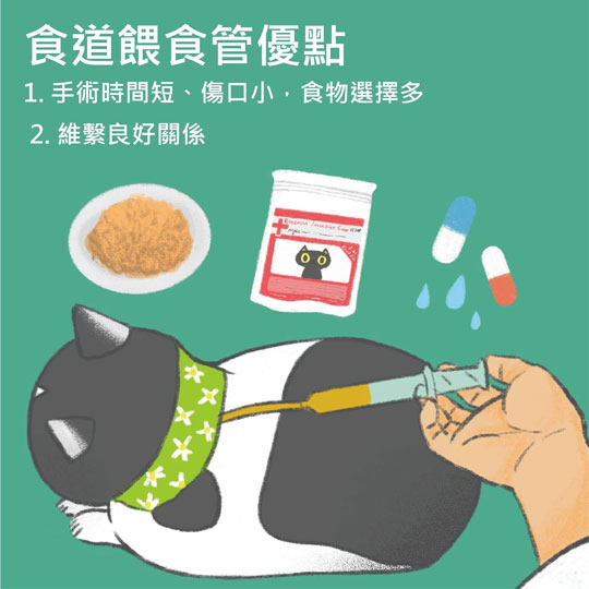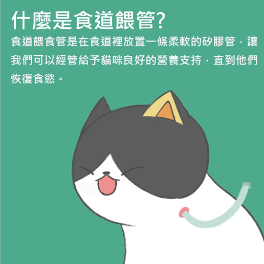 食道餵食管是在食道裡放置一條柔軟的矽膠管,讓我們可以經管給予貓咪良好的營養 支持,直到他們恢復食慾。 貓咪在麻醉狀態下,醫師會在頸部左側的皮膚做一個小切口,放置矽膠軟管在食道內, 並縫合固定管子,讓管子不滑動。我們可利用這條餵食管給予飼料泥、流質食物,除 了營養支持之外,還可透過管子給予藥物與補充水份,比起試圖用針筒從嘴巴灌食, 有了餵食管能大幅降低貓咪因灌食灌藥帶來的緊迫與不適感,也不用為了吃飯這件 事,打壞彼此感情,維持貓咪的生活品質。