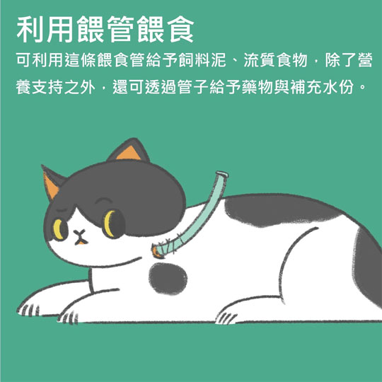 營養支持也是治療疾病不可或缺的部分,當醫師判斷貓咪已恢復足夠自主進食量後, 隨時都可以移除餵管,不需要再次麻醉。