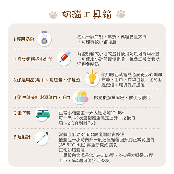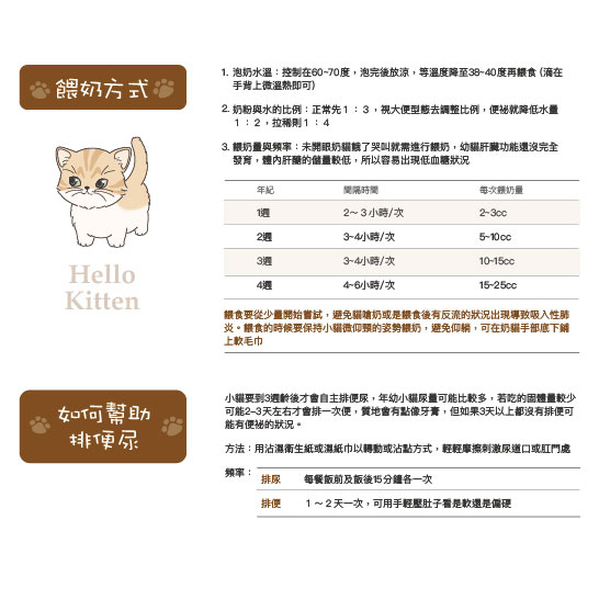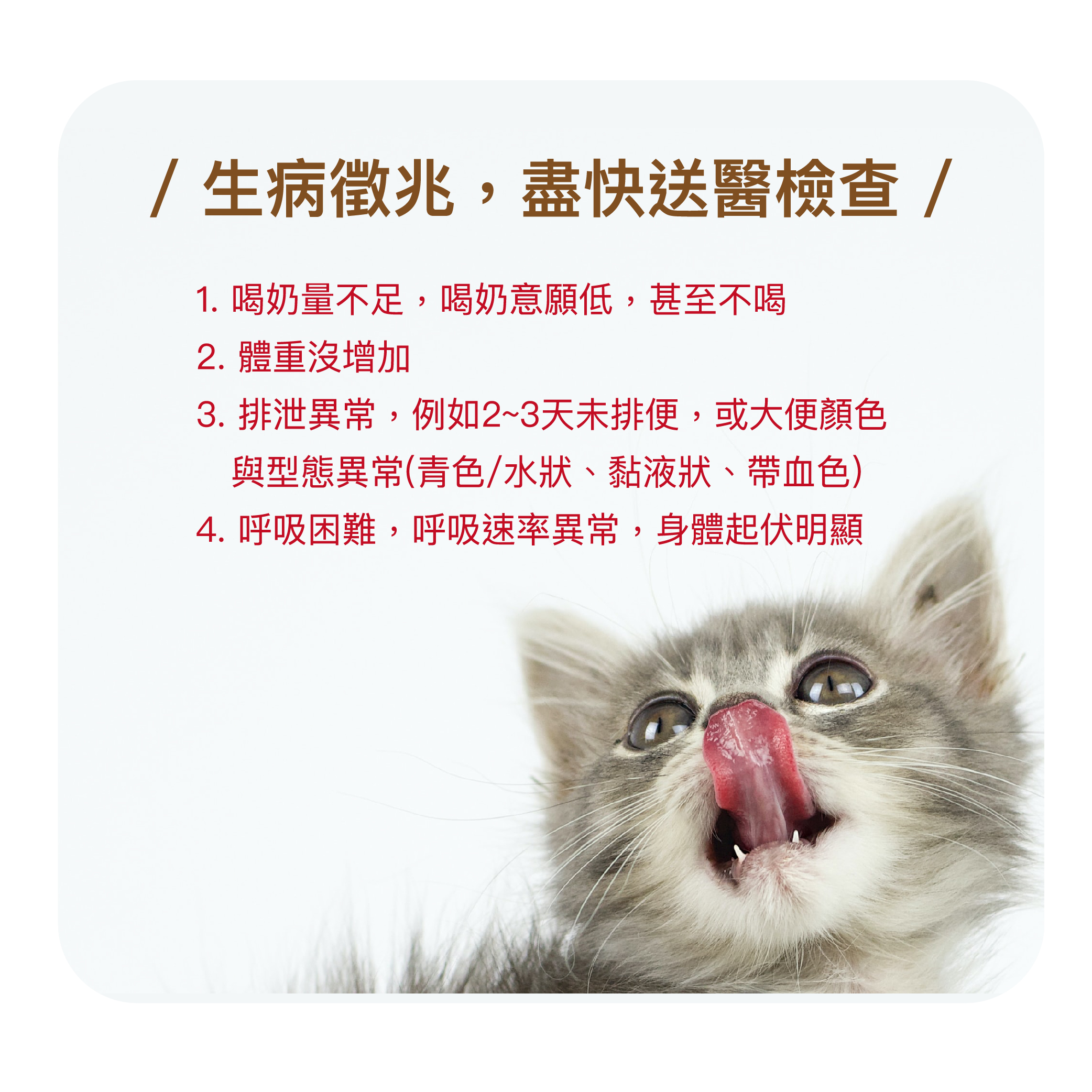- 1.專用奶粉:勿給一般牛奶、羊奶,乳糖含量太高,可能導致小貓腹瀉