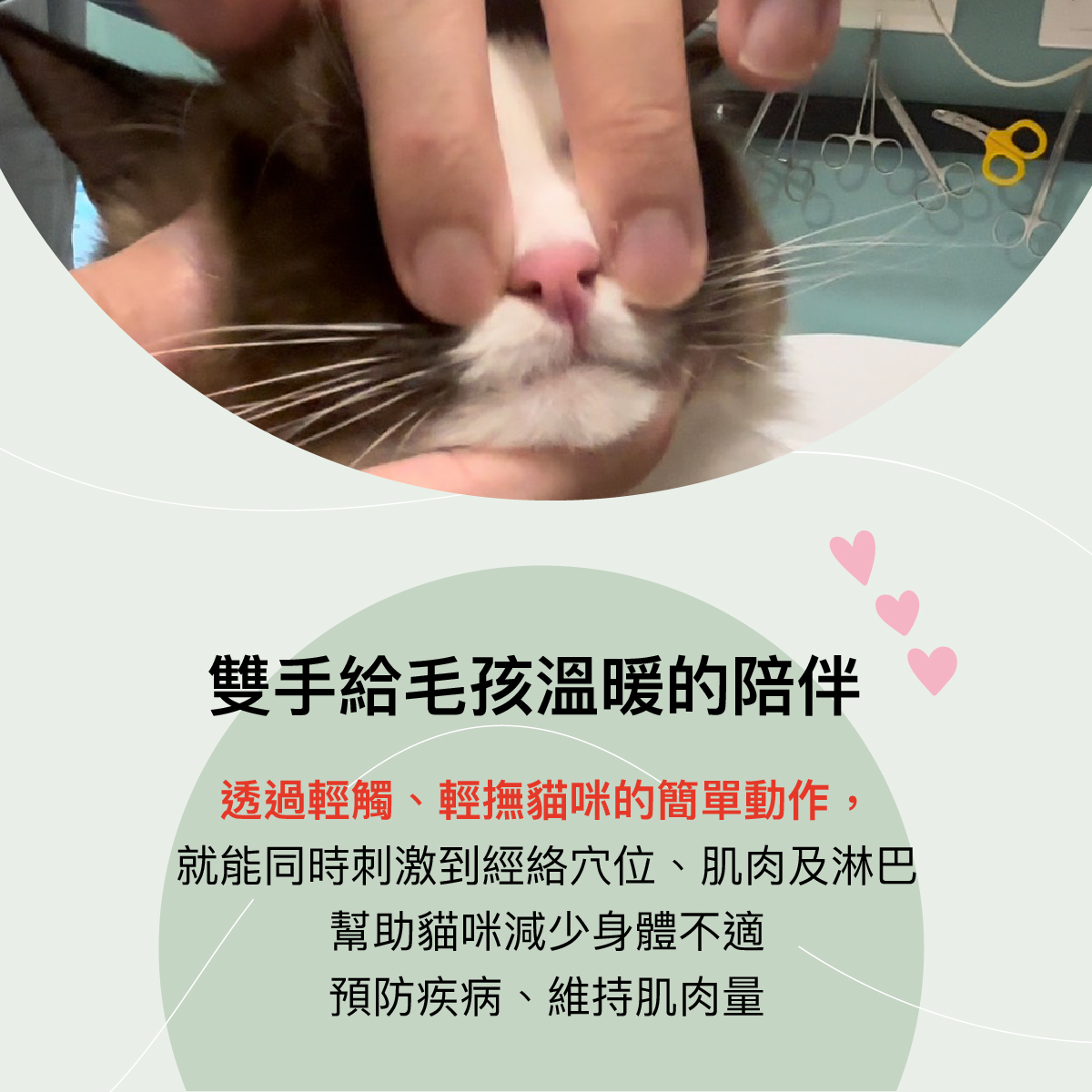 透過輕觸、輕撫貓咪的簡單動作,就能同時刺激到經絡穴位、肌肉及淋巴,幫助貓咪減少身體不適、預防疾病、維持肌肉量。