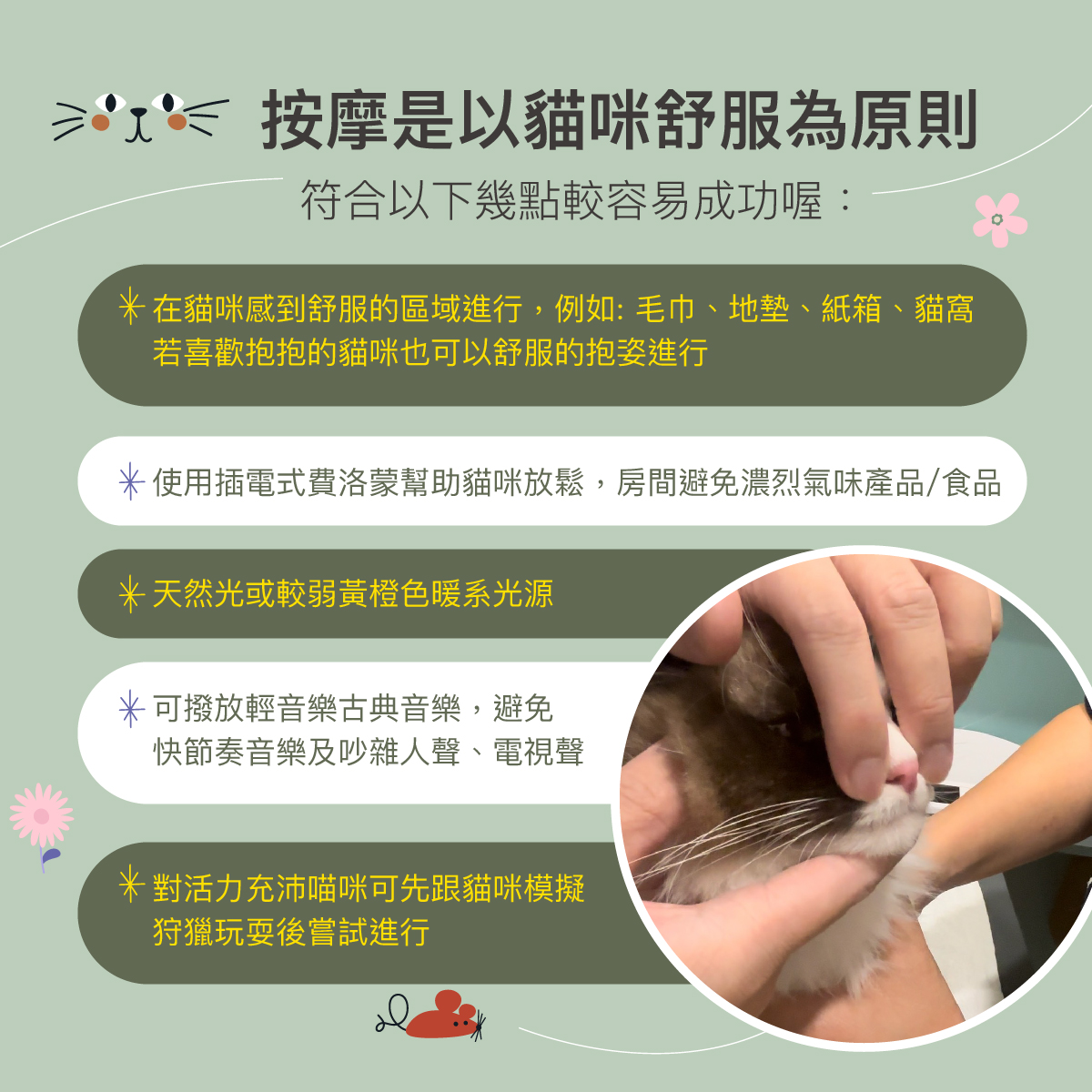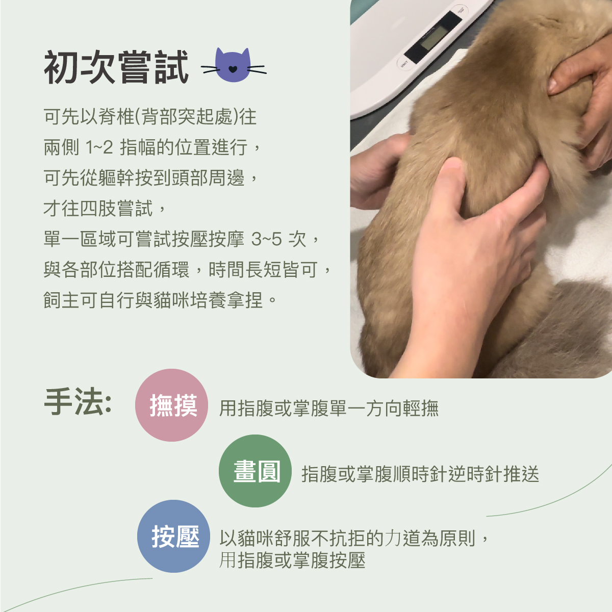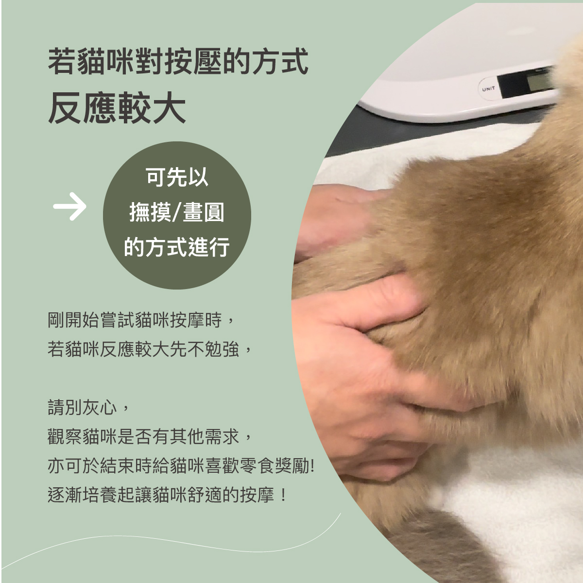 若貓咪對按壓的方式反應較大,可先以撫摸/畫圓的方式進行