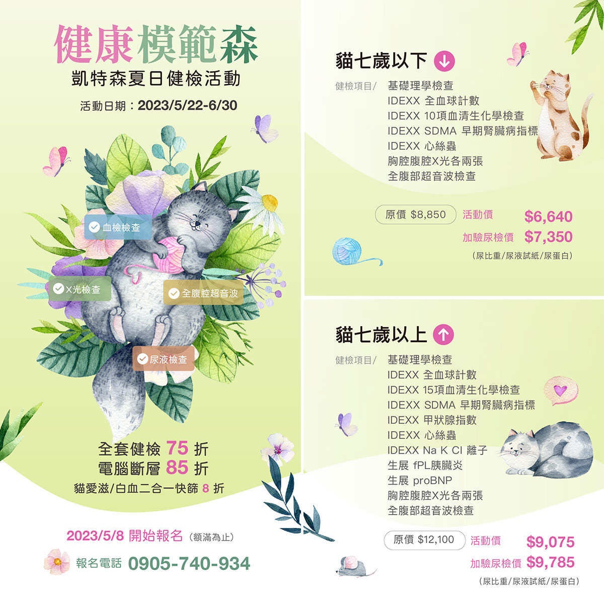 ㄧ樣我們分為七歲以上及七歲以下兩種專案,全套健檢 75折,另外因健檢需要加做的電腦斷層 85折,貓愛滋/白血二合一快篩 8折