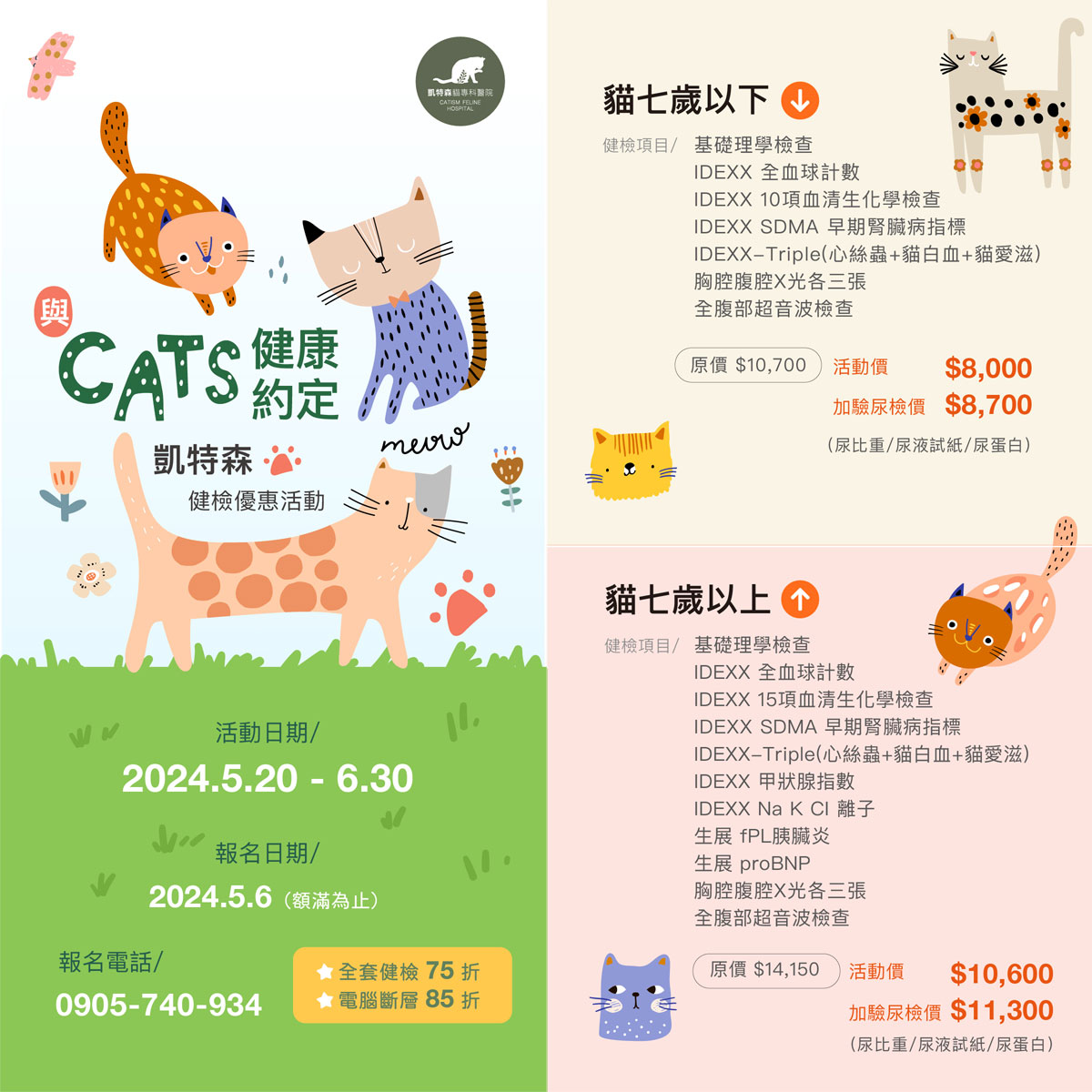 『與CATS健康約定』,凱特森夏日活動健檢開始囉,讓貓主子透過醫生的檢查來了解身體的狀況,維持健康,享受曬太陽、睡覺、玩耍的貓貓日子!