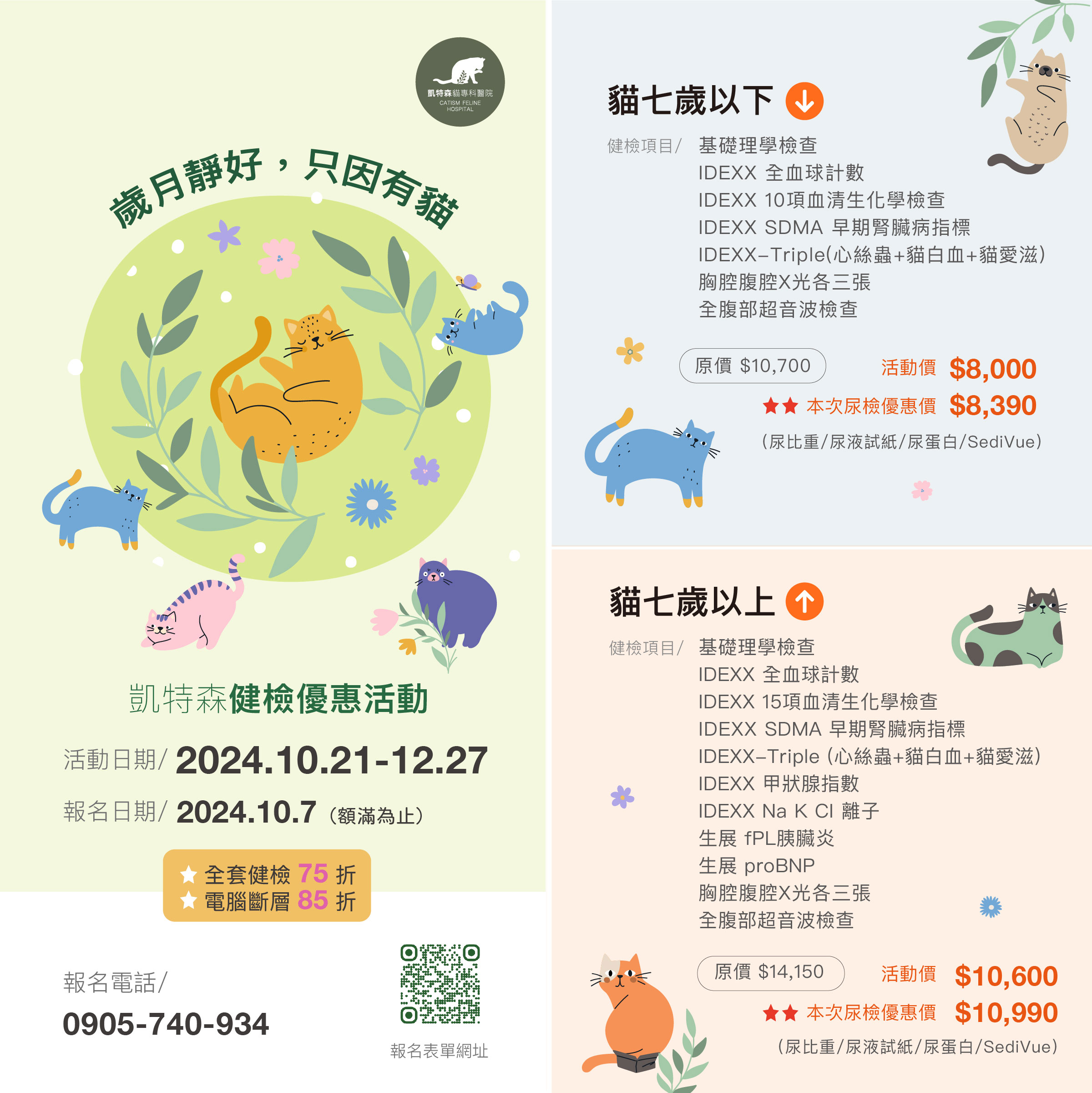 『歲月靜好,只因有貓』,凱特森2024年底活動健檢開始囉,因為有貓,所以日日皆好,貓家人的健康由凱特森為您把關,讓貓主子透過醫生的檢查來了解身體的狀況,好好享受貓日子!