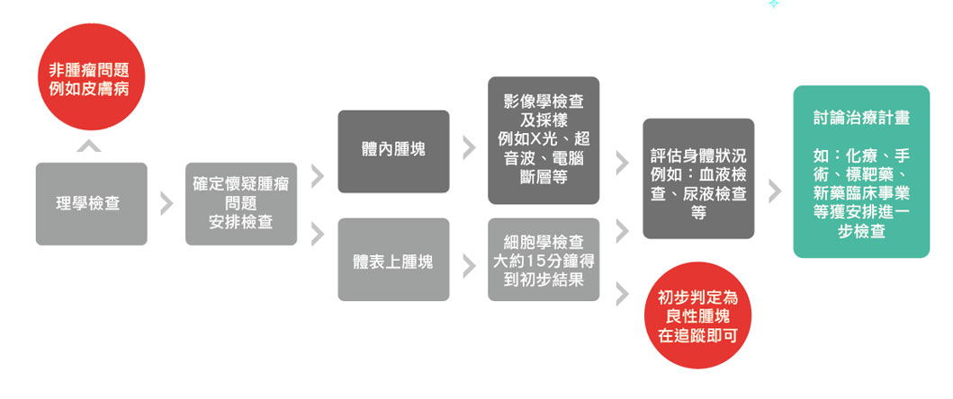 如果腫塊是位在體內,則必須透過X-光、超音波、電腦斷層等影像檢查工具,判定腫塊的位置、大小以及良惡性的表現等等,並且評估是否可以採樣,以提高確診的比例。